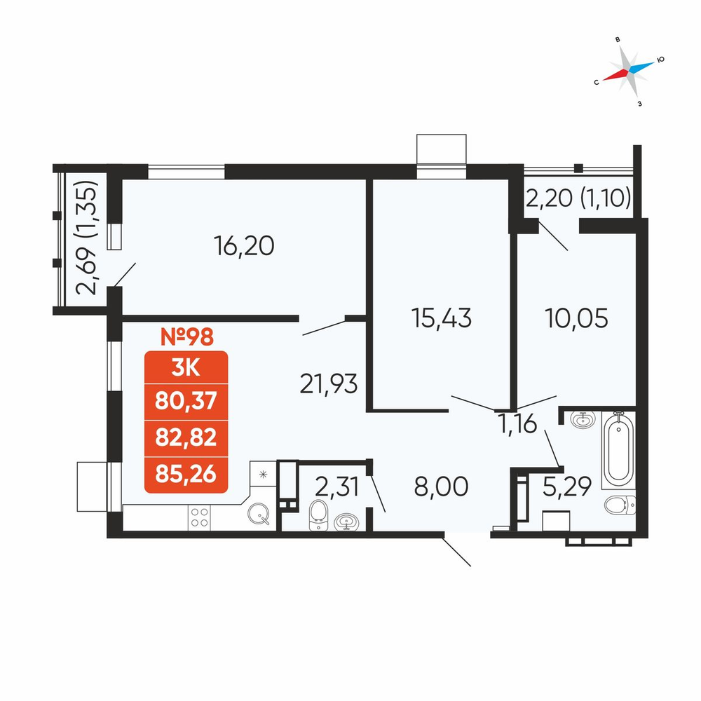 3-комнатная 82.82 м