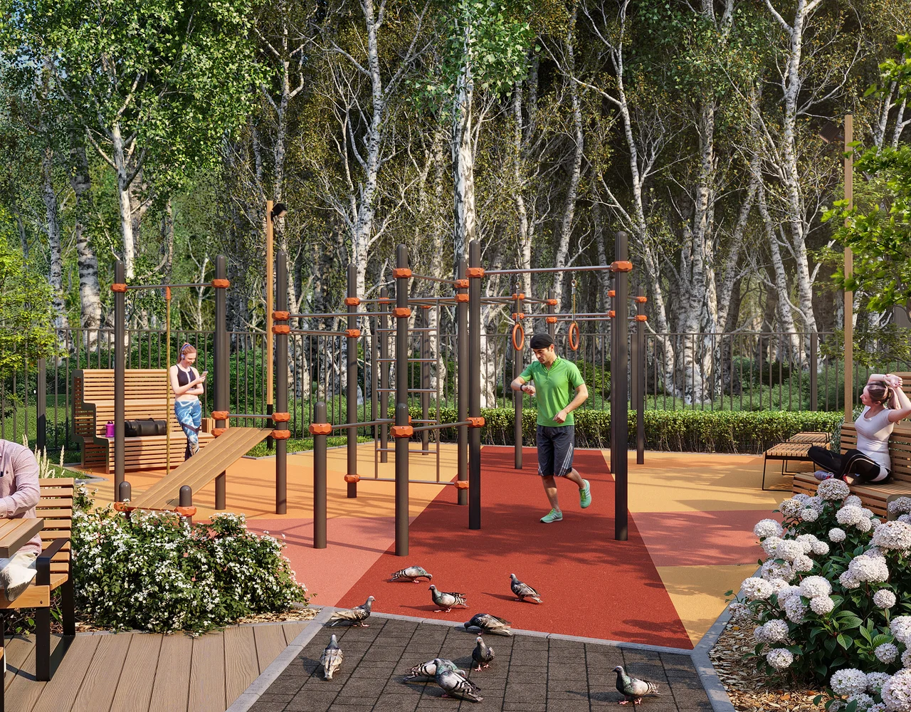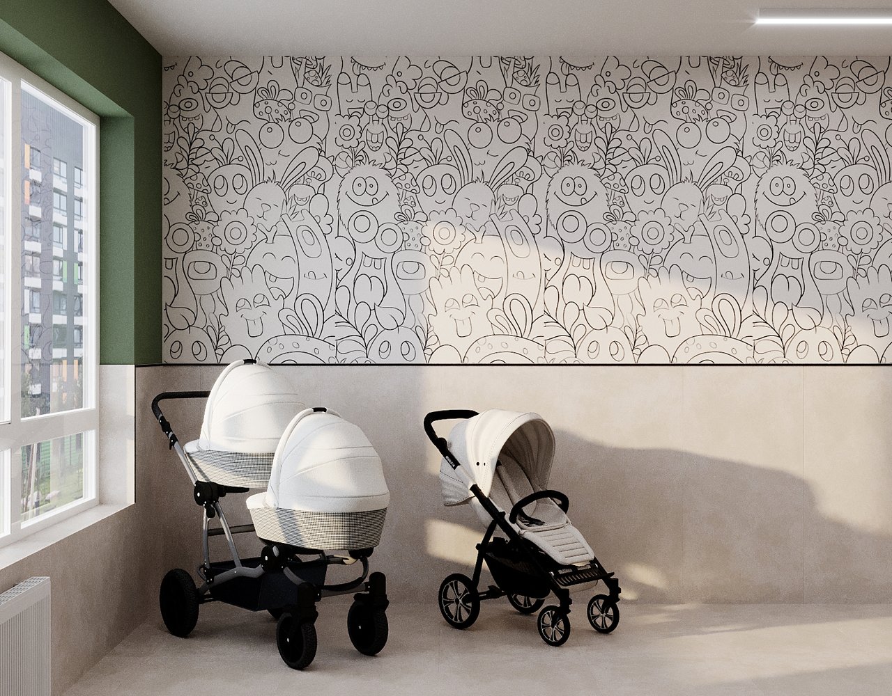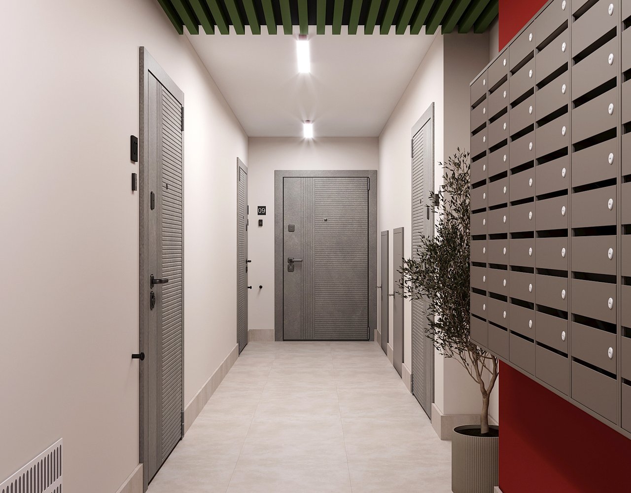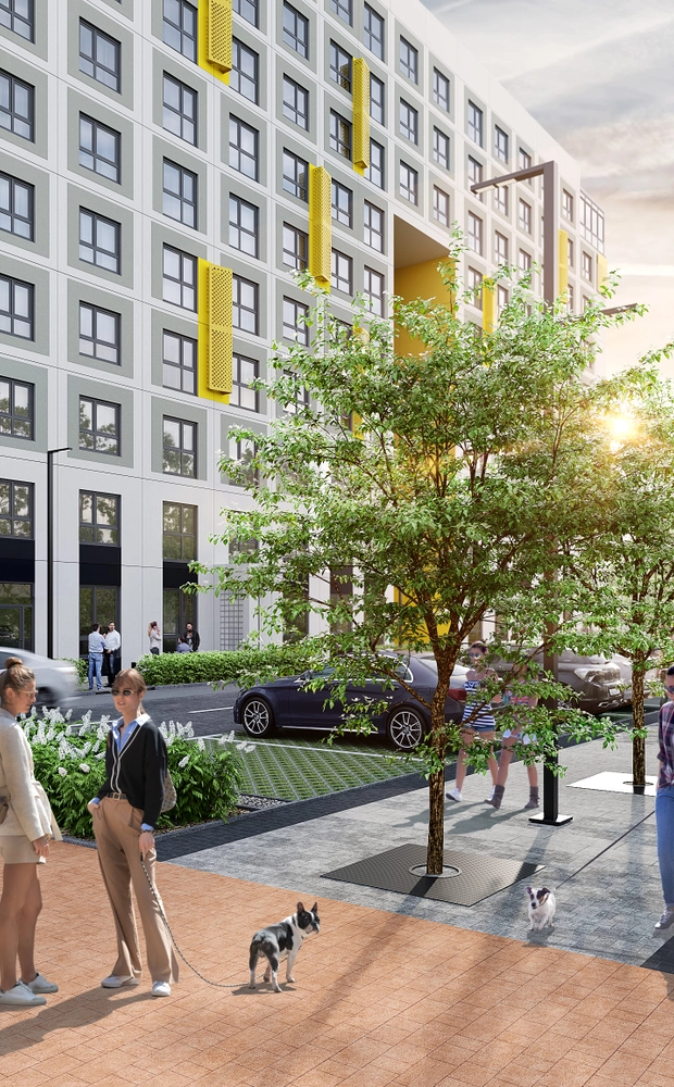 Дизайнерская отделка холлов и помещения для удобного хранения колясок и велосипедов.